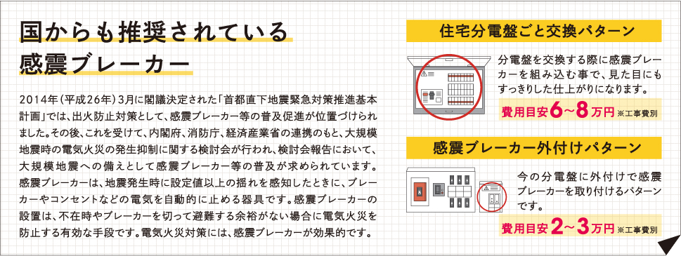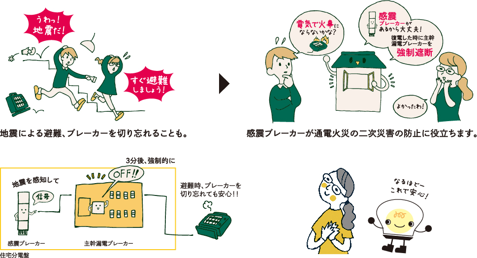 地震がおさまって電気が復旧した時が危険!大きな地震が来ると送電線の保安点検のため一時的に停電になるケースがあり、電気が復旧した時に倒れたストーブなどによる二次災害の危険が潜んでいます。通電火災の二次災害に備えるのが感震ブレーカーの役割です。