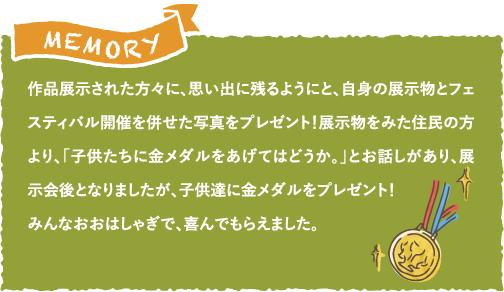 展示期間中は、普段お話しをしたこともない人との交流も多くみられ、作品をみてチャレンジしてみたいなと感じた方や、子供たちの元気な挨拶、自身の作品を見てもらい喜びを感じてくれた方もいらっしゃいました。はじめは3点しか集まらなかったのが、「私も展示されてもらってもいいでしょうか。」子供たちも「家にある絵を飾りたい!」と、冷蔵庫に貼ってあった絵が作品として、住民の3分の1以上(4歳~99歳)の方が作品を提供してくださり、エントランスに作品が溢れるフェスティバルとなりました。