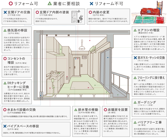 マンションには、コンクリートでできた構造体などの「共有部分」とその内側につくられた天井・床・間仕切り壁などの「専有部分」に分かれ、リフォームできる範囲は「専有部分」になります。また、管理規約の制限や構造的な制約もあり、事前確認が必要です。