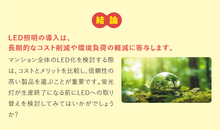 LEDは従来の照明に比べてエネルギー効率が優れており、電気代を節約することができます。大規模な共用部では、この省エネルギー効果がより顕著に現れ、維持管理費の削減に貢献します。