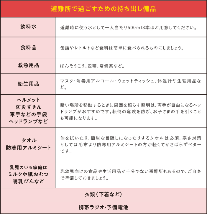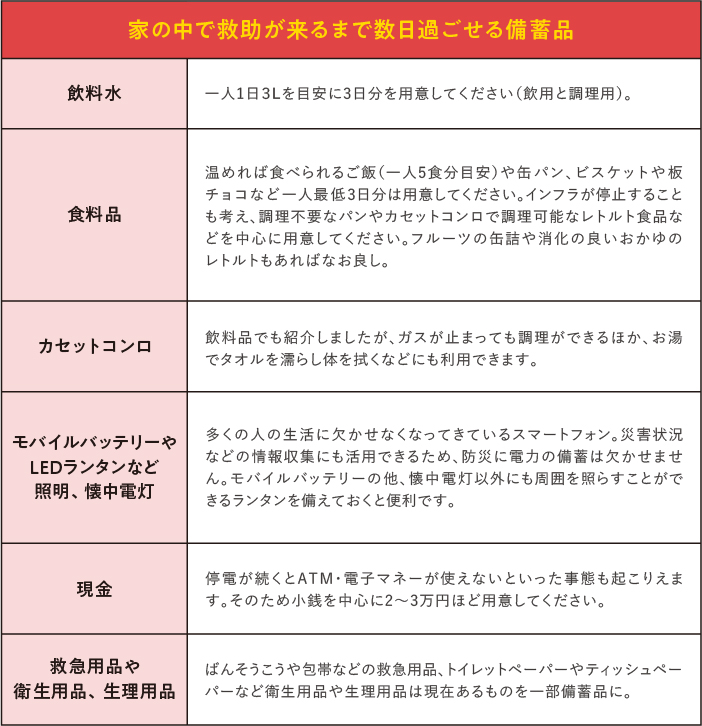 その中でも、①家の中で救助が来るまで数日過ごせる備蓄品 ②避難所で過ごすための持ち出し備品を紹介します。