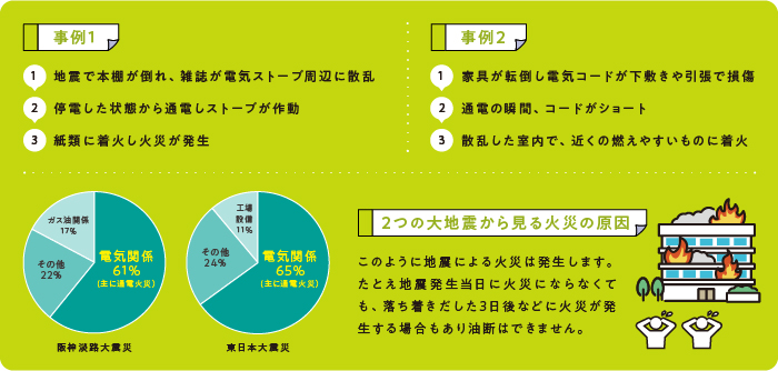 地震による火災発生には様々な要因はありますが、その一つに電気関係の出火が挙げられます。
