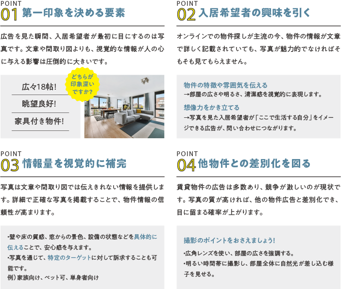 写真へ徹底的にこだわり、第一印象で物件の魅力を最大化しましょう。
