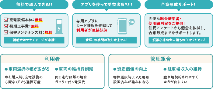 Terra Charge 株式会社は設備導入の初期費用からメンテナンス費用や利用者用スマホアプリと管理用の電気料金システム利用料などの維持管理費用も「無料」で利用可能です。また、24時間365日対応のカスタマーサポートセンターがあり、いつでも安心してご利用いただける仕組みを構築しております。