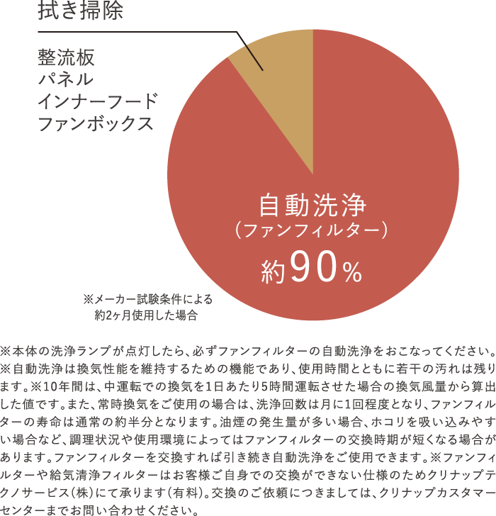 付着汚れの約90%が自動洗浄、だから拭き掃除も約2ヶ月に1回でレンジフード内部は、フラット形状かつ油煙がスムーズに流れる形状。ファンフィルターでレンジフード内の油煙の約90%を捕集し、自動で洗浄できます。また、残りの付着汚れは約2ヶ月に1回の拭き掃除で簡単にお手入れできます。