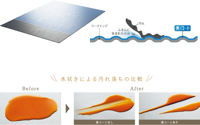 水に馴染みやすい親水性のセラミック系特殊コーティングは、汚れの下に水が入り込み、汚れを浮かします。落としにくい油汚れもサッと水拭きだけでOKです。さらに、ステンレスたわしで擦っても細かいキズがつきにくく美しさを長く保てます。