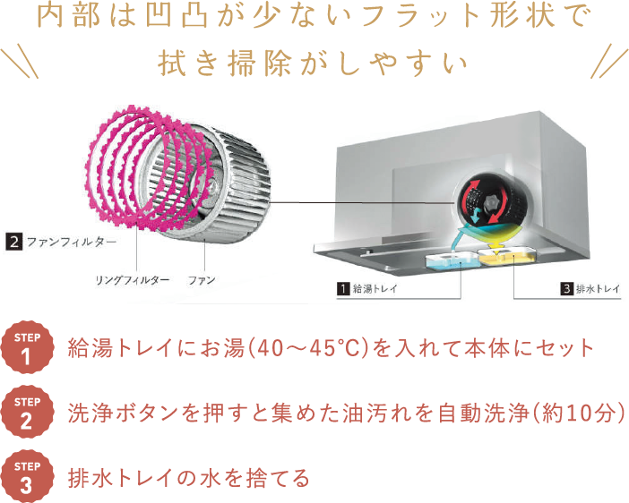 約10年間、自動で洗える形状で拭き掃除がしやすい給湯トレイにお湯(40~45°C)を入れて本体にセット。洗浄ボタンを押すとファンフィルターに集めた油汚れを自動洗浄。約2ヶ月に1度の洗浄で約10年間ファンフィルターを取り外さずにお掃除が可能です。