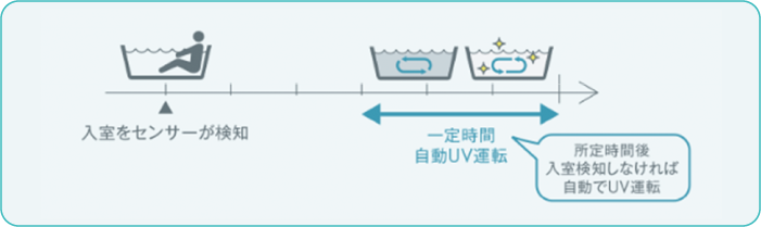 この機能は入浴後のお湯の除菌や、残り湯洗濯の臭いを抑制する機能です。「UVキレイ入浴」機能では、入浴の状況に応じて、自動でUV運転を開始します。給湯器が浴槽の水を取り込み、給湯器内部にあるUV除菌ユニットにてUVを照射した上で、綺麗になったお湯を再度浴槽に送るため、家族が入った後でも気持ちよく入浴することが可能です。さらにUVユニットがLED化したことにより、退浴後5分間UV運転が働く「退浴検知運転」が可能になりました。さらに「残り湯UVキレイ」機能を利用すると、最後の方の入浴終了後、翌日の予約時間まで断続的にUV運転を行います。それにより、菌の増殖を99%抑制した残り湯で洗濯できるため、臭いの発生を抑制することが可能です。