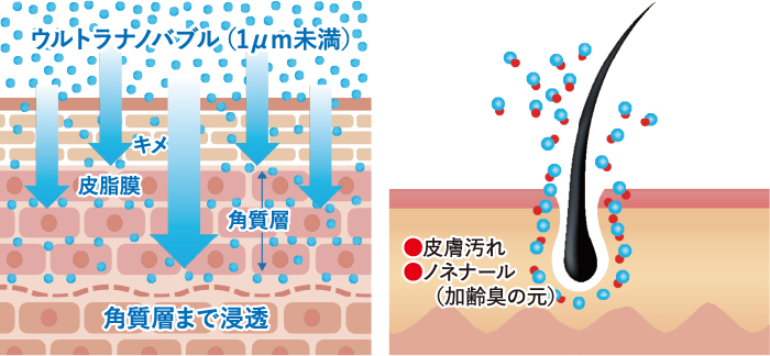 先ほどご紹介した「ウルトラナノバブル」のこうした特徴を生かした2つの優れた効果があります。