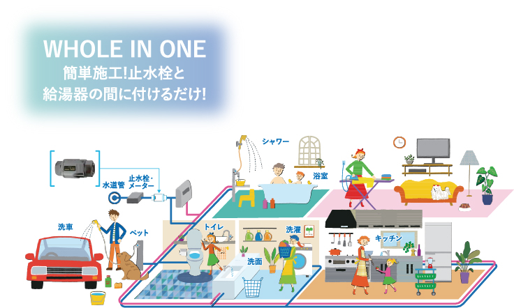 基本的に、水道メーターの後ろに取り付けるだけで、家の中の水道水がウルトラナノバブル水になります。水圧の変化は少ないため、給湯器などの器具にも安心して使用することができます。