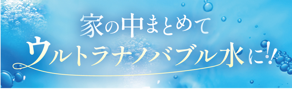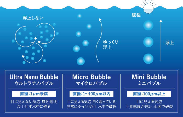 皆様は「ウルトラナノバブル」という言葉を聞いたことはあるでしょうか。少し前からマイクロバブル風呂やシャワーが販売されていたので、「マイクロバブル」をご存知の方は多いと思います。マイクロバブルとウルトラナノバブルの違いは、泡の大きさにあります。マイクロバブルのサイズが0.05mm(=50μm)なのに対して、ウルトラナノバブルはサイズが0.001mm(=1μm)未満の目に見えないほど微細な泡になっています。また、ウルトラナノバブルは、刺激を与えなければ水中に数ヶ月間も留まることも確認されています。どちらの泡も汚れ、異物などに吸着しそれらを剥がす力を持っています。