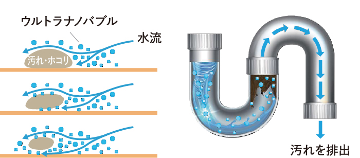 微細な泡が、浴室や洗面所、トイレ等の排水溝や排水管に付着した、頑固な汚れや臭いの原因の小さな隙間に入り込み、汚れを剥離し洗い流すため、水を使って流すだけで、普段掃除ができない排水溝や排水管を掃除することができます。また、泡立ち・泡切れの良さから、シャンプーや洗濯物・洗剤の使用量も少なく、水の使用量も抑えられるため、節水効果も期待できます。