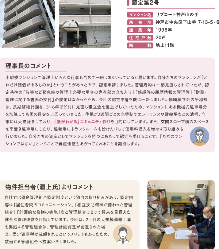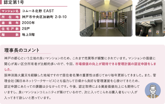 ※コムーネ北野 EAST は、神戸ホームページ神戸市:市内『第1号』誕生!マンション管理計画を認定しました!~分譲マンションの資産価値向上(kobe.lg.jp)より抜粋※リブコート神戸山の手は、マンション管理新聞2023年3月15日発刊より抜粋