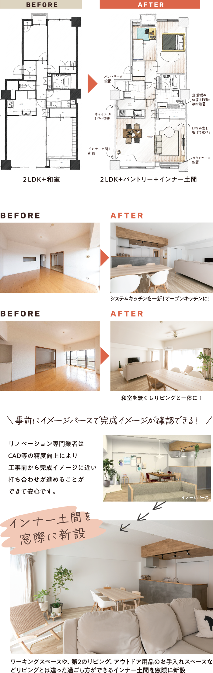 →和室を無くしリビングと一体にして広いLDKと収納確保