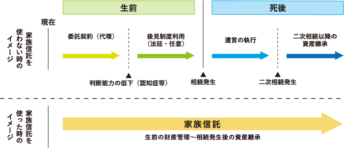 「成年後見制度」は、認知症が発生してから死亡するまでの間に有効な制度です。また、相続財産を承継する先を生前に定めておけることで知られる「遺言」は、死亡後に有効な制度です。一方家族信託は認知症発生前から死亡後までの長期間をカバーし、自分の不動産や金銭の管理を信頼できる家族などに任せることができます。