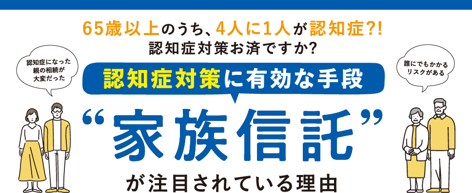 「そろそろ相続のことを考えなくては!」と思っている間に認知症になってしまったというケースが多くなってきました。 認知症になってしまうと、どんな問題が起こるかご存知ですか? 認知症及a最近TVメディア等でも「民事信託」「家族信託」が取り上げられ、注目されています。 今は高齢化が進み、平均寿命が延びるという嬉しい半面、認知症や介護は避けられない問題となっています。こういった解決困難な問題に対し法改正によって「家族信託」が認められ、解決事例が全国でも多く出てきました。 家族信託によってできることは「財産を家族に託して老後を生活したり・次世代に引き継ぐこと」とお考えください。びその予備軍が65歳以上の高齢者のうち、4人に1人 といわれているなど、 対策が急務な認知症対策。 特に多い認知症トラブルをご紹介します。