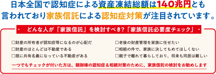 認知症の疑いがある場合の家族信託契約はできませんので、早めのご相談をお待ちしております。