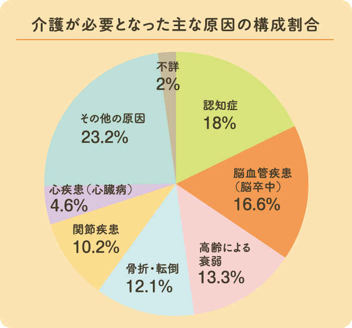 まず最初に、介護が必要になるケースについてお話しします。介護が必要となる原因は様々で、いちばん多いのが認知症。さらに脳血管疾患(脳卒中)、高齢による衰弱、骨折・転倒と続きます。脳の病気は後遺症が残ることが多く、また高齢者はケガをきっかけに寝たきりになってしまうこともあります。そして当然ながら、高齢になればなるほど心身の機能は衰え、介護の必要性が高くなります。現在の日本で要支援・要介護状態にある人のうち、85歳以上の人は60%近くを占めています。「身体能力が落ちて動きにくくなった」「物忘れがひどくなって介助が必要」など、そういった相談は、自治体の窓口や地域包括支援センターで受け付けています。地域包括支援センターは、高齢者についての相談対応・支援を幅広く行っている窓口です。高齢者が住み慣れた地域で生活できるよう、専門知識をもつ職員が日常生活の相談に応じ、介護・福祉分野で利用できるサービスを提案してくれます。また、介護保険の申請窓口にもなっています。