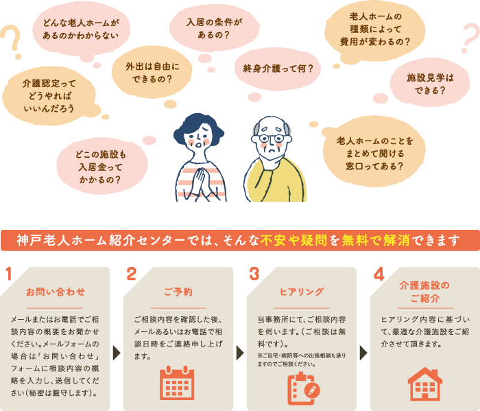 様々な老人ホームや介護施設が存在します。そういった施設を利用したいとなった時、どうやって選んだら良いのか分からない。ほとんどの方がそう思われることでしょう。もちろんご自身が施設に足を運び、確認されて気に入った施設を選択されるのもいいのですが、数も多く大変な労力となります。そんな際にご利用頂けるサービスとして「神戸老人ホーム紹介センター」があります。こちらでは神戸市内の様々な施設と提携し、ご入居者様の状態やご要望に合わせて施設をご紹介することが可能です。ご予算や、どういったケアが必要かなどケアマネジャーやヘルパーなどとも相談しながら、ベストな施設をご紹介してもらえます。