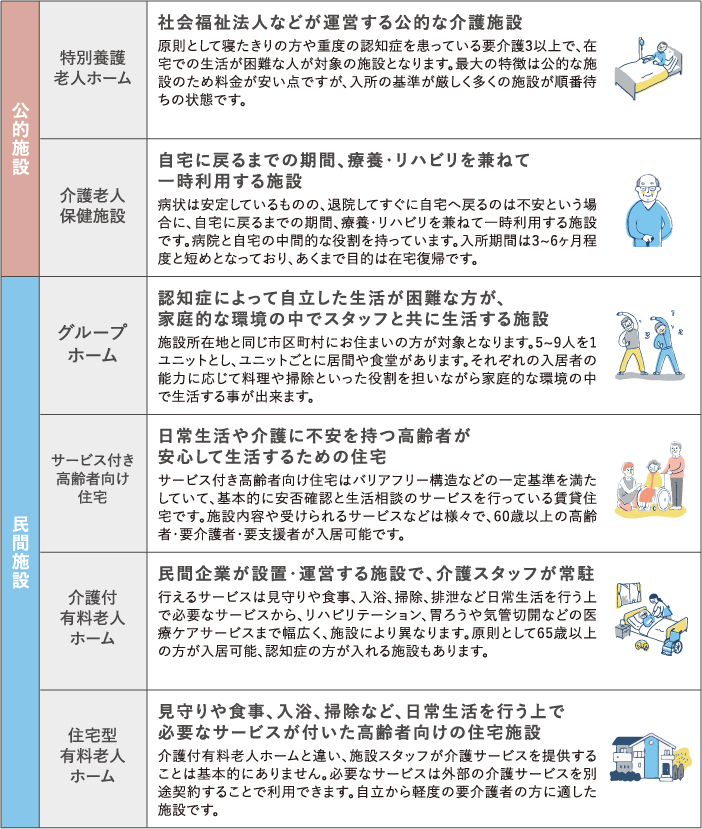 超高齢化社会に突入した日本。先号より引き続き、高齢者の介護施設について解説をいたします。誰しもいつかは高齢になり、こういった施設に頼る可能性があります。その際に「どこでもいいから空いてる施設に」よりは「自身に合った施設を選びたい」と思われませんか。その為には、どの施設がどういったサービスを提供できるのか知っておく必要があります。今回は施設の種類と利用できる介護の度合いなど知っておきましょう。
