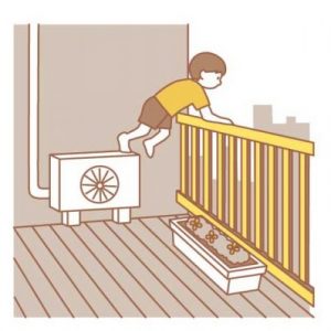 また、エアコンの室外機なども同様です。柵から離れた位置に設置すれば安全だと考えられがちですが、子供の脚力でも室外機からベランダの柵まで、簡単に⾶び移ることができる場合もあります。
